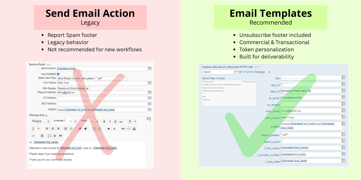 Email Templates are the recommended way to send emails from Podio workflows using GlobiMail. They are designed to align with up-to-date best email practices while providing greater reliability and control.