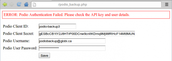 7 - Copy & Paste the Podio Client ID and Client Secret, and the login username and password of your main Podio user (actually, I would suggest you create a new user all automation purposes, just make sure to make this user a member of all Workspaces)